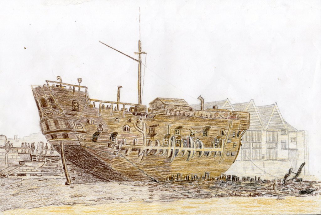 At Egypt Bay, I laid the bike down, took my rucksack off and lit a cigarette. Between drags I flicked through Bea Cowan’s Saxon Shore Way, to check that this was indeed where prison ships were moored during the Napoleonic Wars. I squinted across the grey water to where I imagined they would have been, then crushed the cigarette underfoot, despite the dryness of the grass that invited me to sit down. I closed my eyes to better conjure up old decaying hulks no longer fit for service; cribbed and barred, rotting to death and stuck fast forever to the mud of the estuary bed by ancient rusted chains manacled to great heavy anchors that made these once-proud craft prisoners too. I could hear the moaning of convicts and prisoners of war incarcerated between the low decks of the foetid hold. The ceilings were too low for the inmates ever to be able to stand, so they stooped, or lay down on the bare floor in the dark, crowded spaces, clamped in irons.